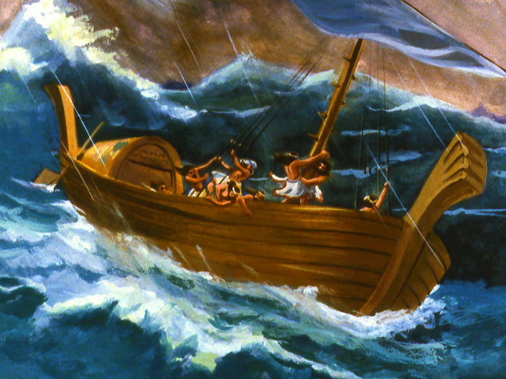 Terwyl almal skarrel aan boord en tot hul afgode bid vir redding is Jona vas aan die slaap. Sy slaap is ʼn aanduiding van sy ongevoeligheid vir die wat saam met hom aan boord is en ook vir die mense van Nineve. Die kaptein spreek Jona aan en vra hom “wat makeer jou dat jy so slaap” en beveel hom om tot sy God te roep en dat sy God hulle miskien kan red. Nadat die manne loot kom hulle agter dat Jona die skuldige is. God gebruik hulle heidense gebruik om vir hulle aan te toon wie die skuldige is. Spreuke 16:33 Die lot word gewerp in die vou van die kleed, maar elke beslissing daarvan kom van die Here. Nadat Jona alles aan die manne vertel het, van sy wegvlug van God, die God van die hemel wat die see en die droë land gemaak het, het die manne bang geword. Watter ironie! Die heidene het meer vrees vir God as die profeet van God. Dit was ook Maleagi se aanklag teen die Jode, nl. dat God meer gevrees was deur die heidene as deur Sy eie volk. Maleagi 1:11 Immers, van waar die son opkom tot waar hy ondergaan, is my Naam groot onder die nasies en op elke plek word reukwerk en ‘n rein offer aangebied vir my Naam, want my Naam is groot onder die nasies,” sê die Here, Heerser oor alle magte.