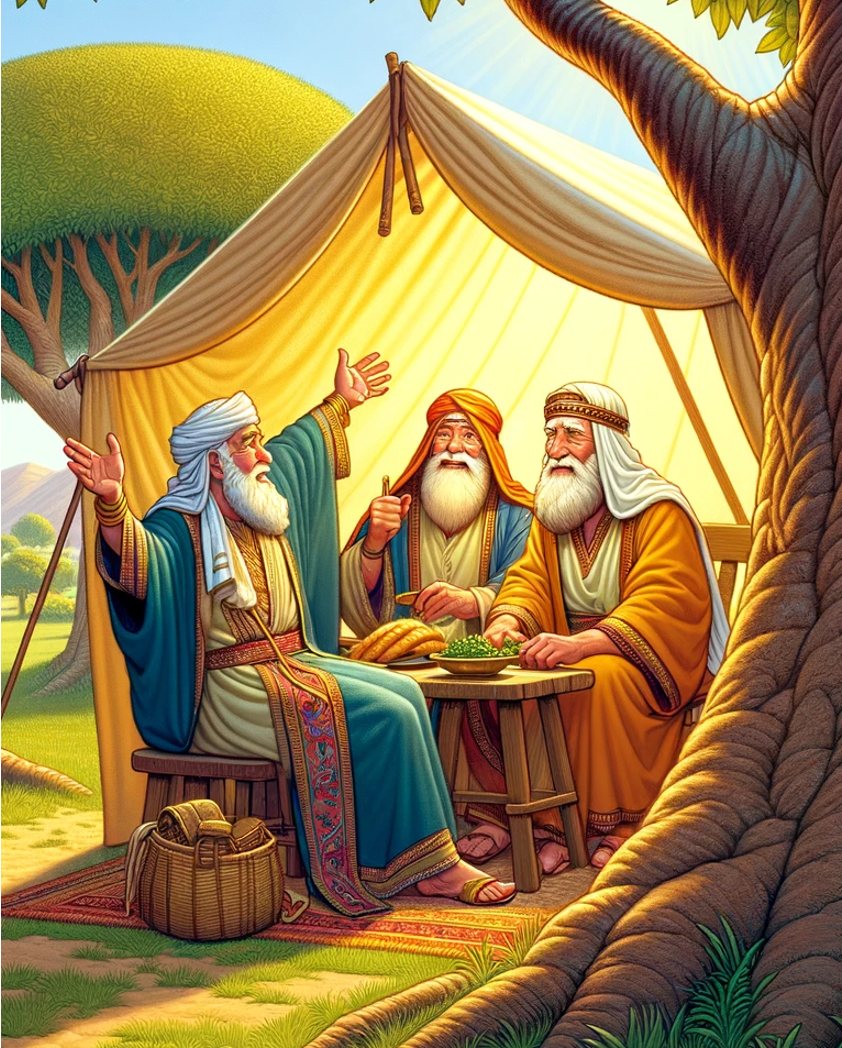 Op ‘n warm, sonnige dag het Abraham by sy tent gesit by die groot bome van Mamre. Skielik het hy opgekyk en drie besoekers gesien wat naby staan. Al het Abraham nie geweet wie hulle was nie het hy vinnig opgestaan, na hulle toe gehardloop, en hulle gevra om te bly en te rus.