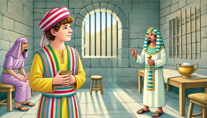 Josef was in die tronk, maar God was steeds met hom. Twee ander mense was ook daar: die skinker en die bakker van die koning van Egipte. Hulle het iets verkeerd gedoen en daarom het die koning hulle in die tronk gesit.