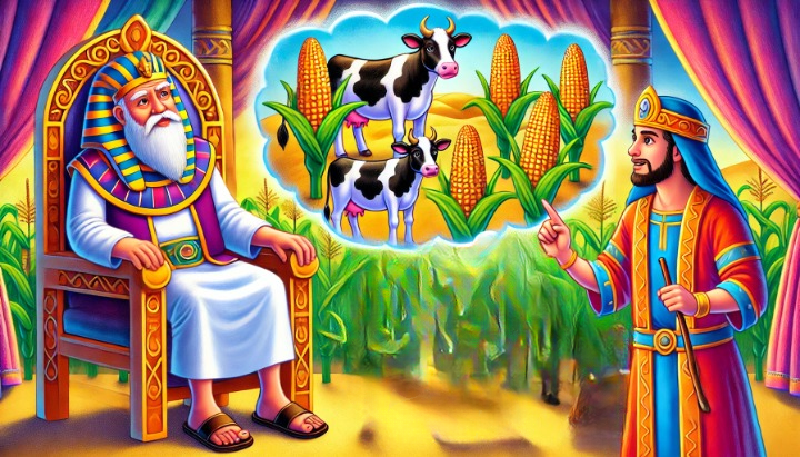 Die koning van Egipte, die farao, het twee drome gehad wat hom baie bang gemaak het. In die eerste droom het hy gesien hoe sewe vet koeie uit die rivier kom en gras eet. Daarna het sewe maer koeie uitgekom en die vet koeie opgeëet. In die tweede droom het hy gesien hoe sewe mooi koringare opkom. Toe het sewe dun koringare gekom en die mooi koringare opgeëet.