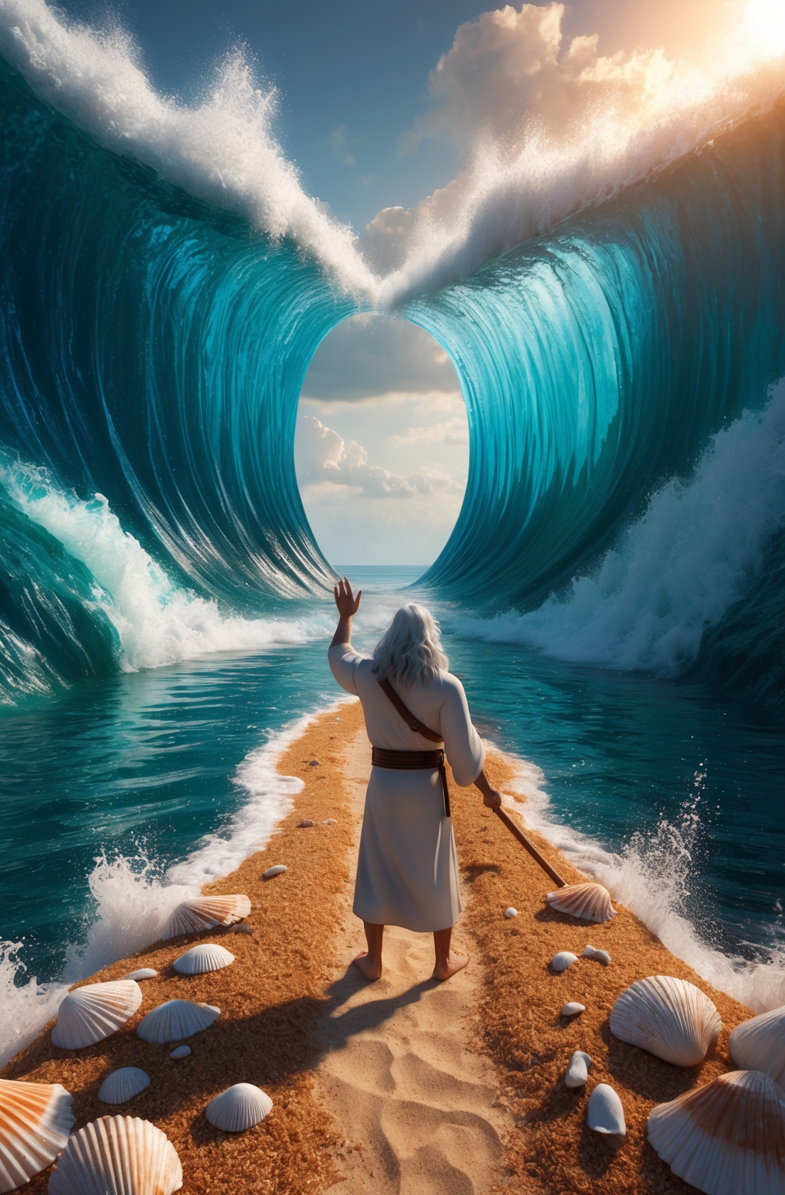Moses het sy hand oor die see gehou, en die Here het die see met ‘n sterk oostewind laat oopgaan. Die water het soos mure aan die kante gestaan, en die Israeliete het op droë grond tussen die watermure deurgeloop.