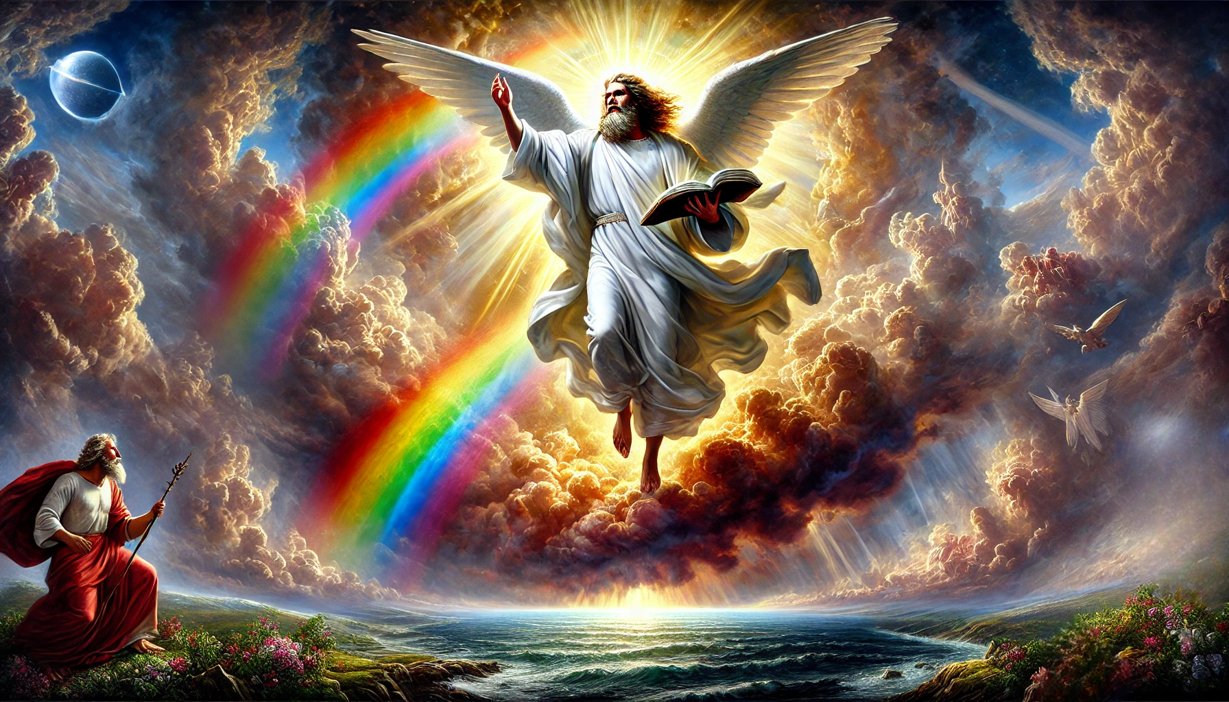 “…met ‘n reënboog bo sy kop. Sy gesig was soos die son, en sy voete soos vuurpilare.”