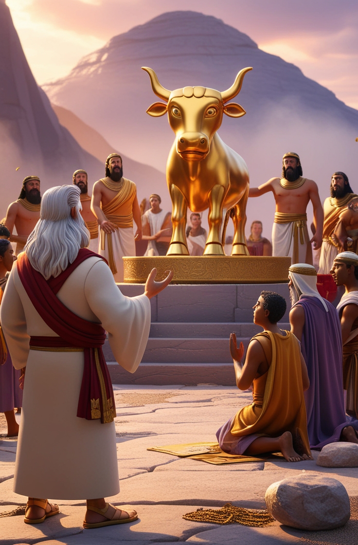 Hulle het na Moses se broer, Aäron, toe gegaan en vir hom gevra om vir hulle ‘n god te maak. Aäron het gesê: “Bring vir my al julle goue oorringe.” Die mense het hulle goue juweliersware gegee, en Aäron het dit gesmelt en in die vorm van ‘n goue kalf gemaak. Die mense het gesê: “Hier is die god wat ons uit Egipte gebring het!”
