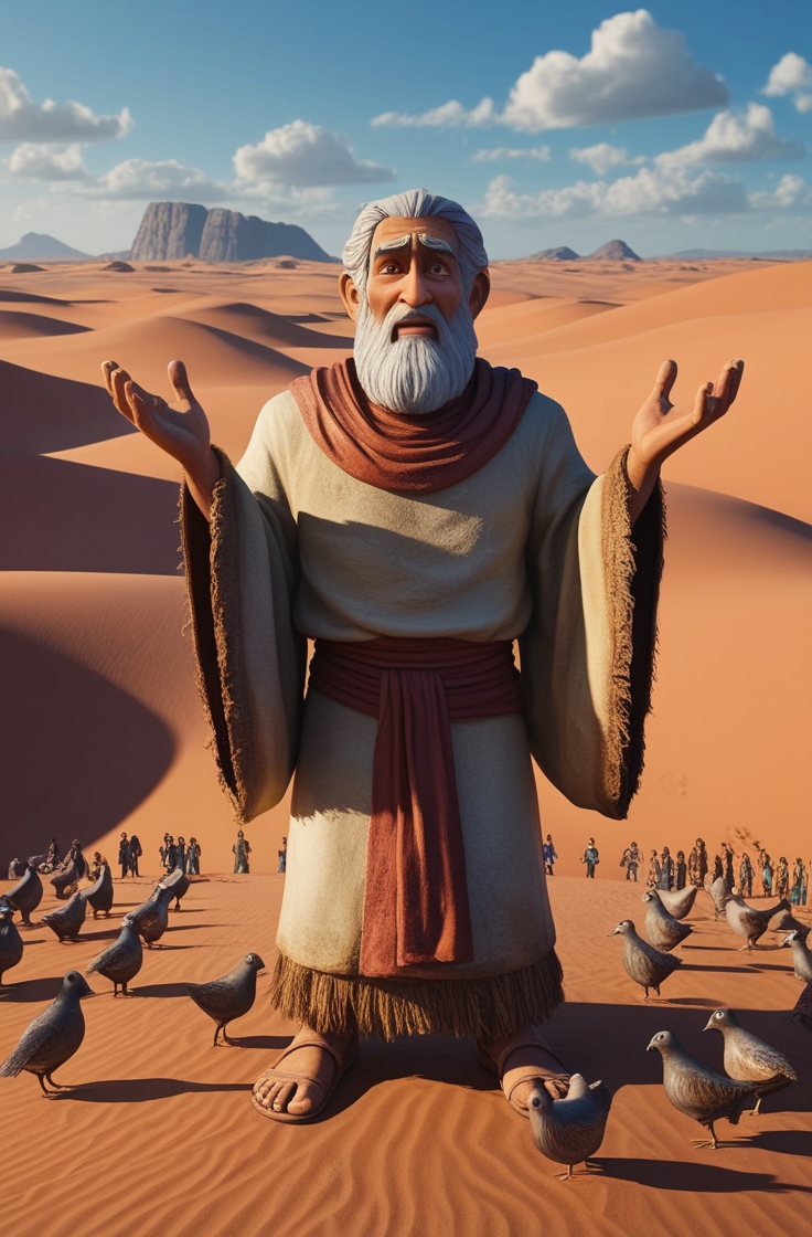 Die Israeliete het deur die woestyn gereis. Maar hulle het begin kla omdat dinge nie gegaan het soos hulle dit wou hê nie. Hulle het gesê dat hulle moeg was vir die manna en dat hulle vleis wou hê. Hulle het terugverlang na die vis, komkommers, waatlemoene, uie en knoffel in Egipte.