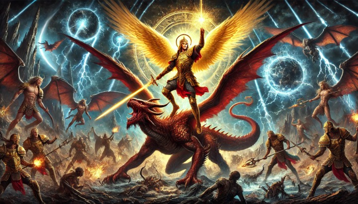 In Openbaring 12:7-12 word die geestelike oorlog wat op die aarde aan die gang is, aan die leser geopenbaar vanuit die hemelse perspektief. Die fisiese gebeure in terme van die geskiedenis van die mens op aarde vorm deel van hierdie oorlog alhoewel ons dit nie in kronologiese volgorde moet sien nie, maar as ʼn oorlog wat van die Skepping af al woed tussen die Satan en God. Die uitslag van die oorlog is aan God en sy kinders bekend, al woed dit nog onverpoos voort.