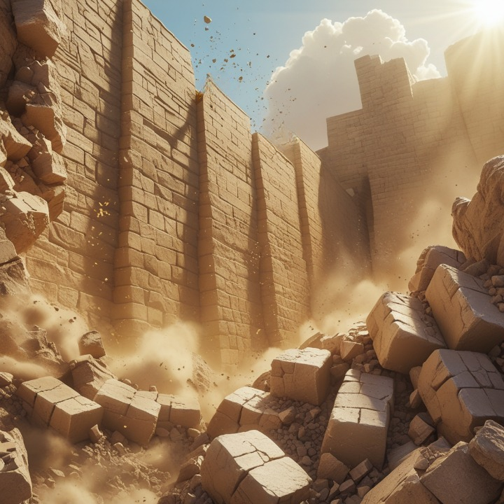 Jerigo het hulle stadsmure toegesluit omdat hulle bang was vir Israel. Niemand kon in- of uitgaan nie. Toe sê die Here vir Josua: “Ek het Jerigo, sy koning en sy soldate in julle mag gegee. Julle moet ses dae lank elke dag een keer om die stad loop. Sewe priesters moet ramshorings dra en voor die ark van die Here uitloop. Op die sewende dag moet julle sewe keer om die stad loop, en die priesters moet op die horings blaas. Wanneer julle die ramshorings op die sewende dag hoor blaas, moet die volk hard skree. Dan sal die mure van die stad inval, en die Israeliete kan reguit ingaan!”