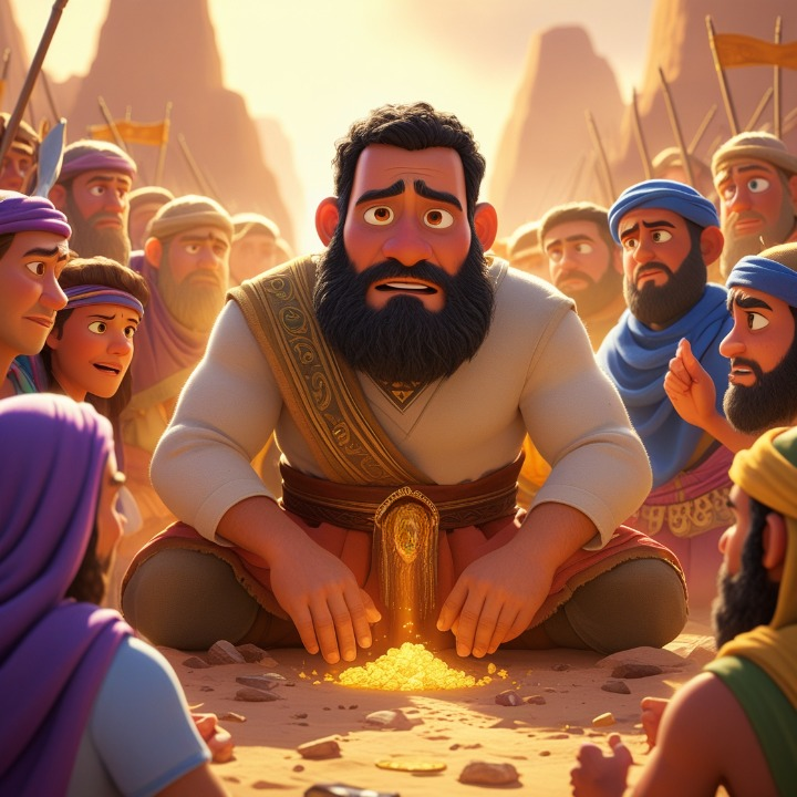 Nadat Jerigo se mure geval het, het God vir Josua en sy mense gesê: “Moenie iets uit Jerigo vir julleself vat nie. Alles daar behoort aan My.” Maar Agan, een van die Israeliete, het nie geluister nie. Hy het ‘n mooi mantel, 200 silwerstukke en ‘n goudstaaf gevat en dit onder sy tent in die grond weggesteek.