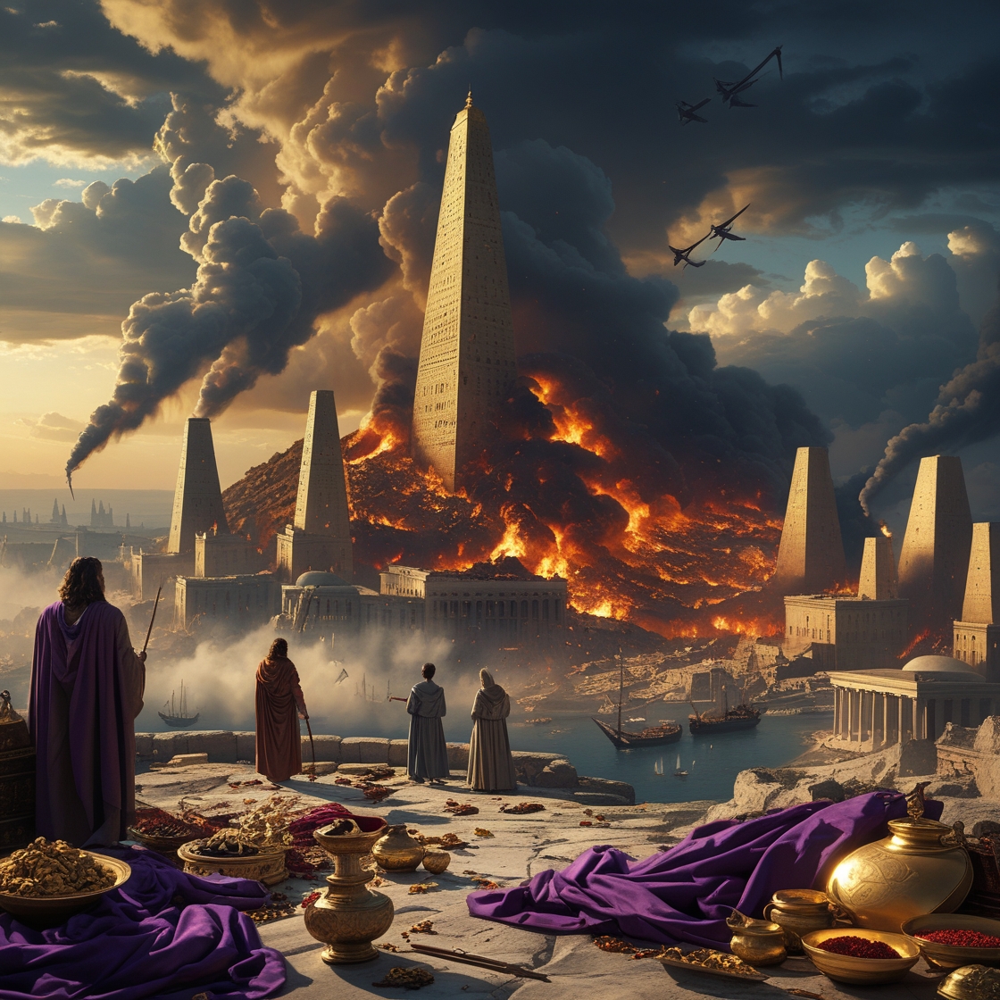 Die wat huil oor Babilon is dieselfde groep as die in Esegiël, naamlik die konings, die matrose en handelaars op aarde. Die verband tussen ekonomiese welvaart en afgodery word oral in die Bybel beklemtoon. Hulle is geskok dat so ʼn groot en ryk “stad” in ʼn oomblik, “een dag”, verwoes kon word. Hulle staan op ʼn afstand uit vrees vir haar foltering. Nieteenstaande die verwoesting wat mense sien, sal hulle hulself nie bekeer nie. So sal die Seun alle konings verwoes en hulle regerings tot ʼn einde bring. Psalms 2:9 Jy sal hulle verpletter met ‘n ystersepter, soos erdewerk sal jy hulle stukkend slaan.