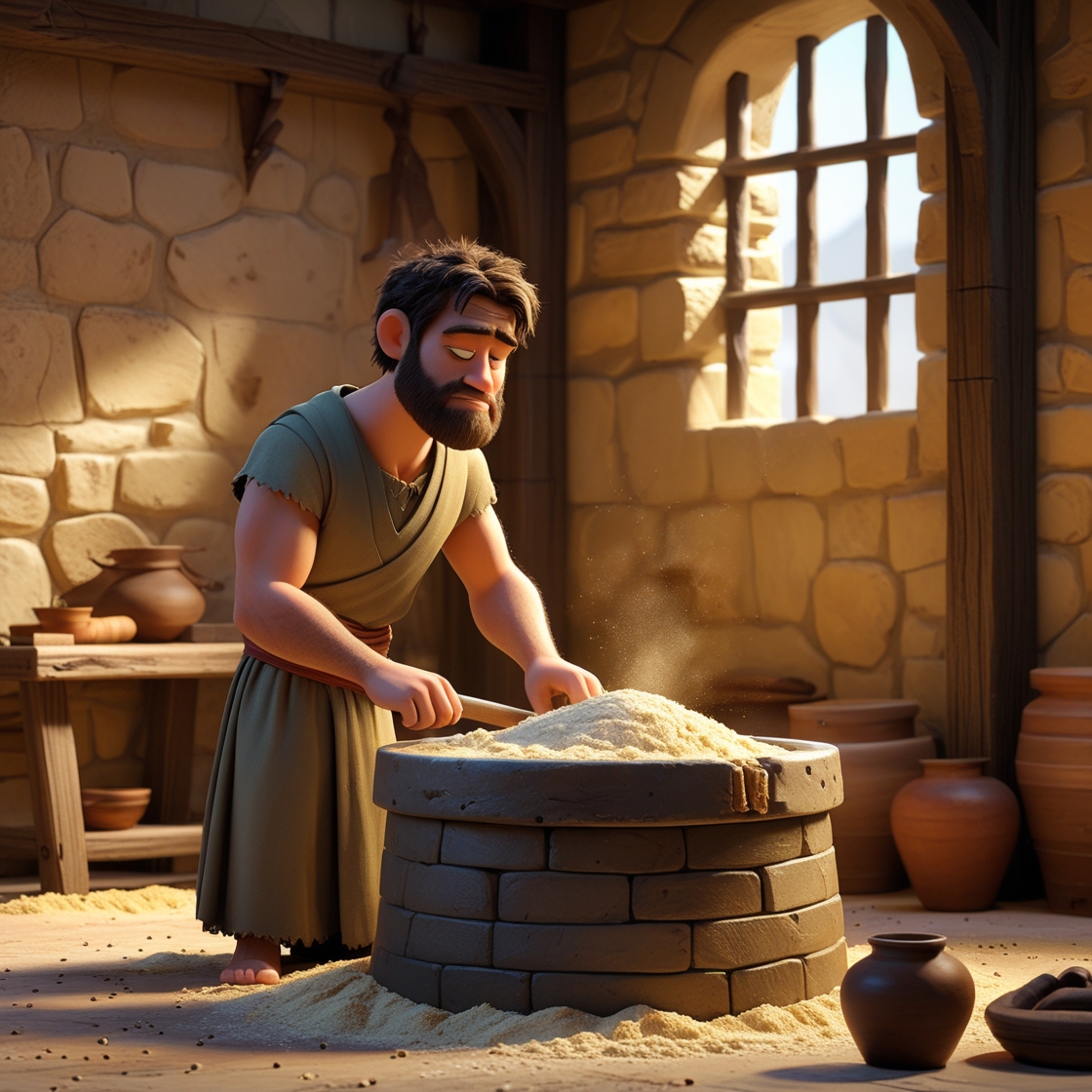 Die Filistyne het hom gevang, sy oë uitgesteek en hom tronk toe geneem. Maar sy hare het weer begin groei.