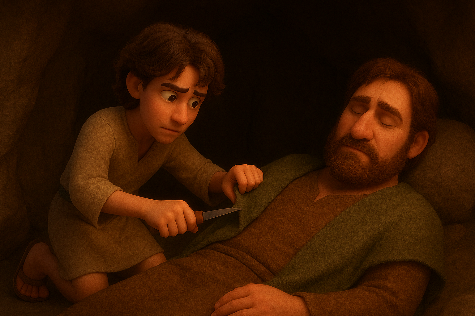 Eenkeer het Saul in ’n grot ingegaan om uit te rus. Maar Dawid en sy manne was agter in daardie selfde grot. Dawid se manne het gesê: