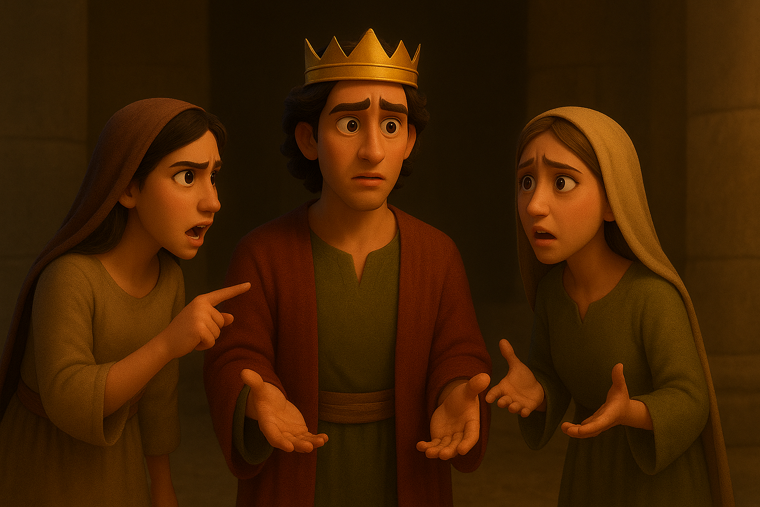 “Ag, my heer, ek en hierdie vrou woon in dieselfde huis. Ek het ’n seun gehad, en drie dae later het sy ook ’n seun gehad. Haar baba het egter in die nag gesterf, omdat sy in haar slaap op hom gelê het. Toe het sy my baba by my weggeneem terwyl ek geslaap het, en haar dooie baba by my gesit. Toe ek in die oggend wakker word, sien ek die kind by my is dood, maar toe ek goed kyk, sien ek dit is nie my babatjie nie.