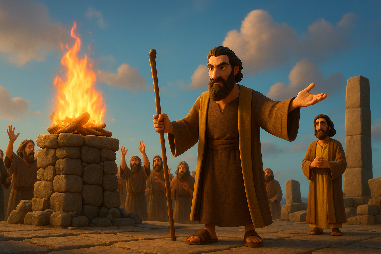 Toe het Elia die volk nader geroep. Hy het die Here se altaar, wat stukkend was, herstel en twaalf klippe gebruik — een vir elke stam van Israel. Hy het hout op die altaar gesit, die bul voorberei, en gesê dat hulle drie keer water oor alles moet gooi totdat die sloot om die altaar vol water was.