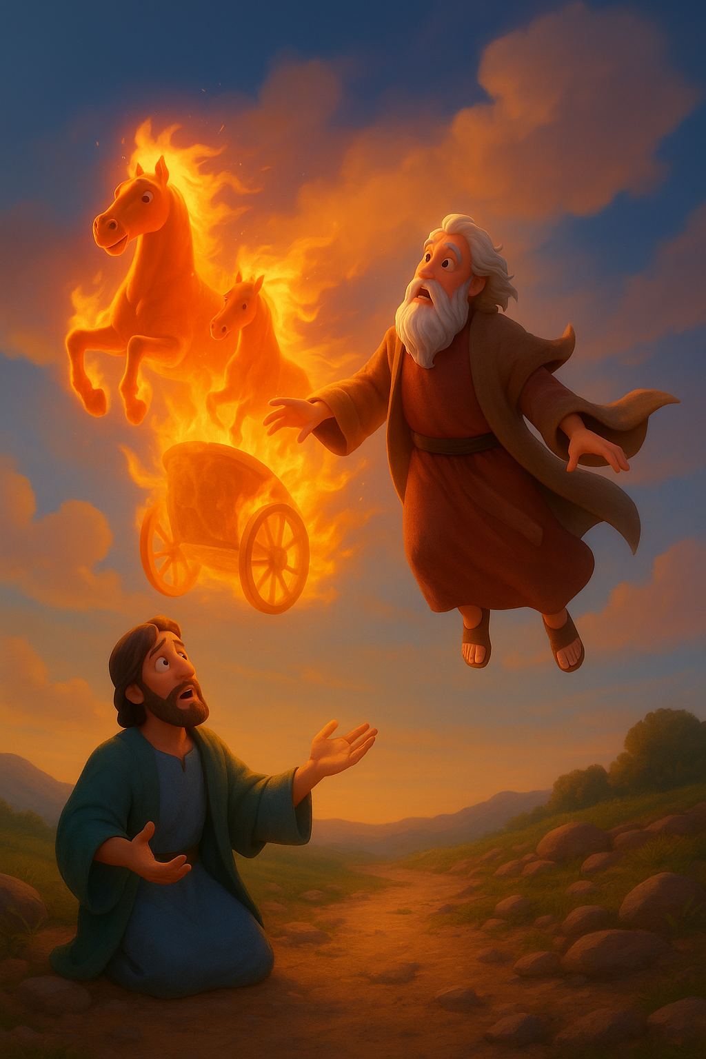 Terwyl hulle nog saam loop en praat, het daar skielik ’n strydwa en perde van vuur tussen hulle deur gekom. Elia is in ’n stormwind na die hemel opgeneem.