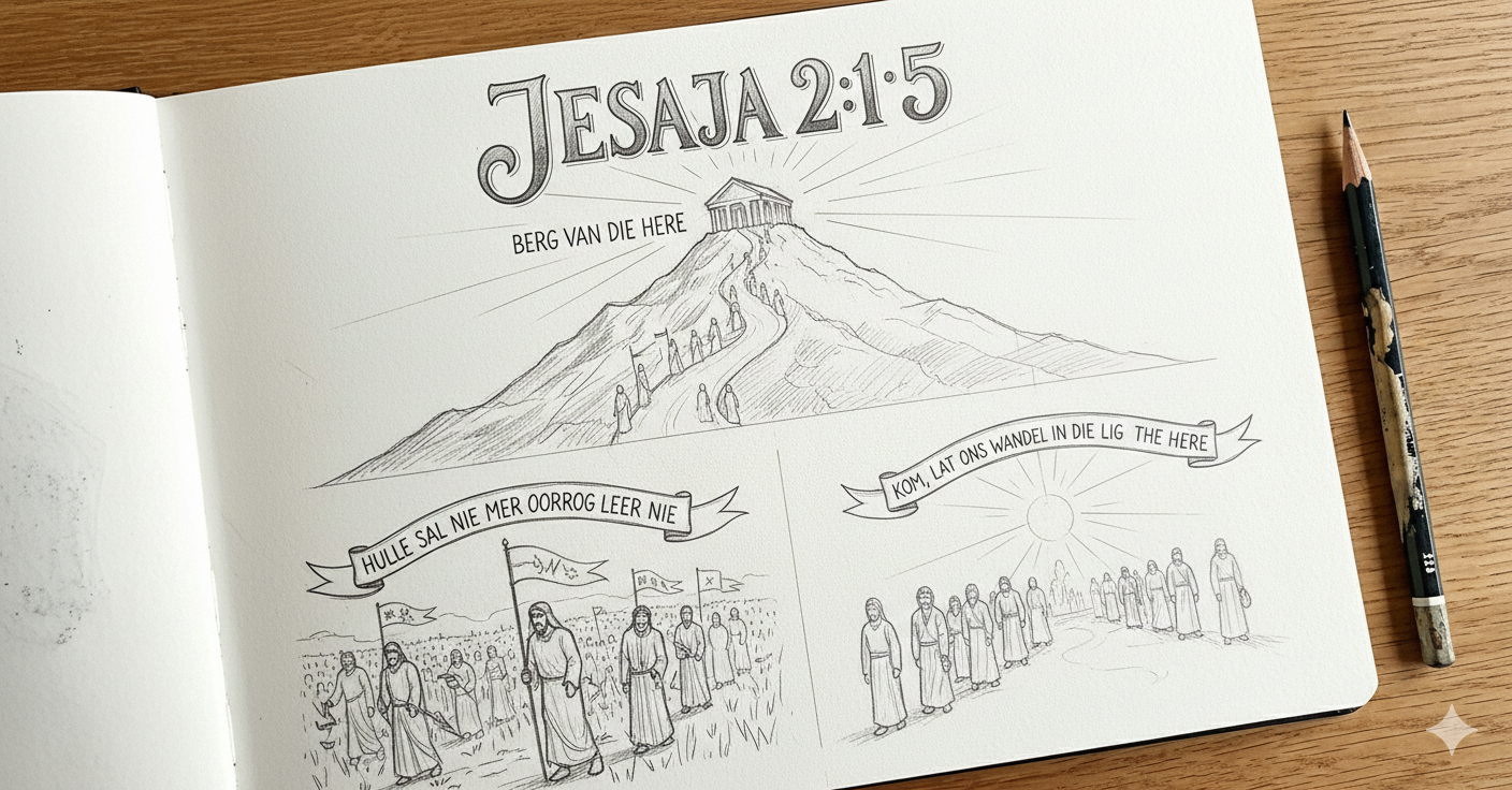 As ʼn persoon met ʼn ander persoon praat hoor die ander een die woorde, maar as God met Jesaja praat sien hy God se Woorde. Dit wat Jesaja gesien het bevestig dit wat God alreeds aangaande Juda en Jerusalem in hoofstuk 1 belowe het. Jesaja 1:26-27 Ek sal jou regters tot inkeer bring soos dit voorheen was, en ook jou raadgewers soos dit aan die begin was. Daarna sal jy genoem word: Stad van Geregtigheid, Getroue Vesting. Sion sal net deur reg vrygekoop word, en dié van haar wat terugkeer, deur geregtigheid. Dit wat God aan Jesaja openbaar, deur dit wat hy sien, korreleer met dit wat God alreeds deur Sy Woord aan Hom openbaar het. Jesaja 2:2-4 word herhaal in Miga 4:1-4. Jesaja sien die laaste dae, wat nie net wys na die eerste koms van Christus nie, maar ook na die wederkoms van Christus. Ons het sekerheid dat daar beslis ook oor die wederkoms gepraat word, omdat die term “einde van die dae” gebruik word. Dit word versterk deur die berg van die Here te noem. “…berg van die Here se huis stewig staan as die hoogste van die berge; hy sal bo die heuwels uittroon.” Jesaja 2:2. Sion is alles behalwe ʼn hoë berg en kan meer vergelyk word met ʼn heuwel. So word hierdie plek ook besing deur die Psalmdigter. Psalms 68:16-17 Massiewe bergreeks, bergrug van Basan, bergreeks met pieke, bergrug van Basan, waarom kyk julle met afguns, bergreekse met pieke, na die berg wat God gekies het as sy woonplek? Sion is die plek waar Christus sou hang aan ʼn kruis en sou die plek van versoening wees vir al ons sonde. Dit is ook waar die Here vir altyd sal woon. Die volkere het geglo dat die berge die plek is waar die gode woon en tog sal Sion, wat nie naastenby so indrukwekkend soos die ander berge lyk nie, vir ewig die plek wees waar God sal woon. Dat die berg Sion sal uittroon bo alles wys na die tyd wanneer Christus weer sal kom. Dit word ook bevestig deur Esegiël. Esegiël 40:2 In visioene van God het Hy my na die land Israel geneem en my neergesit op ‘n baie hoë berg waarop daar aan die suidekant iets soos ‘n geboude stad was. So word dit ook deur Sagaria geprofeteer. Sagaria 14:10 Die hele land sal verander word soos die Araba vanaf Geba tot by Rimmon suid van Jerusalem. Jerusalem sal egter uittroon; sy sal gevestig wees op haar plek: van die Benjaminpoort tot by die plek van die vroeëre poort en tot by die Hoekpoort, en van die Gananeltoring tot by die koning se kuipe. Hierdie plek sal nou verhewe wees bo alles en dit sal duidelik wees dat God hoër is as al die afgode die dag as al hulle sogenaamde woonplekke gelyk gemaak word. Sy woonplek sal bo hulle almal uittroon. Dit sal die plek wees waar die Nuwe Jerusalem sal staan as die nuwe aarde geskep is. Openbaring 21:10 Hy het my toe deur die Gees na ‘n groot en hoë berg geneem, en aan my die heilige stad Jerusalem gewys wat van God uit die hemel neergedaal het.