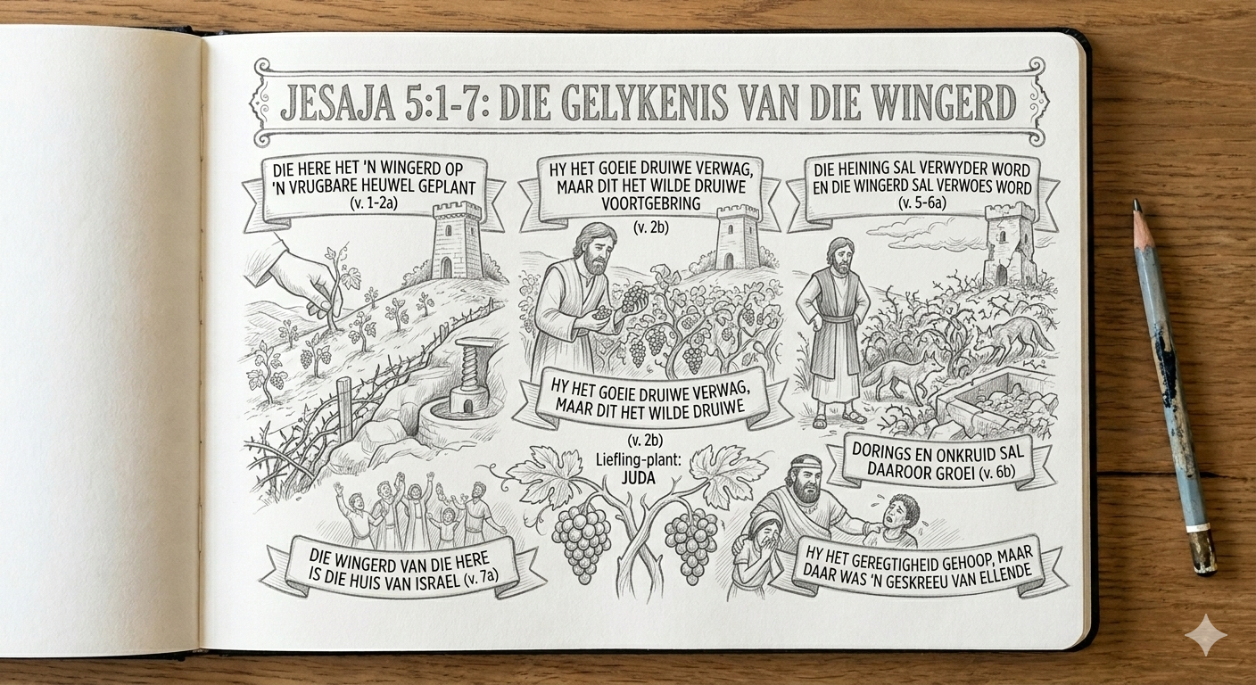 God het ʼn hofsaak teen sy wingerd en die volk, wat deur die wingerd verteenwoordig word, word ingeroep as die regter wat die oordeel moet fel tussen God en sy wingerd. So seker is die saak dat die volk geen ander manier het as om te verklaar dat die wingerd skuldig is nie en die wingerd is hulle self! So was Dawid ook deur die profeet met ʼn gelykenis gekonfronteer na sy sonde met Batseba waarin hy die oordeel uitspreek teen die ryk man in die gelykenis wat die arm man se enigste lam geneem het en dit vir homself geneem het, net om te verneem dat hy die man is. 2 Samuel 12:5-7a Dawid het baie kwaad geword vir daardie man. Hy het vir Natan gesê: So waar as die Here leef, die man wat dit gedoen het, verdien die dood. Die ooilam moet hy viervoudig vergoed, omdat hy hierdie daad gedoen het en nie die arm man jammer gekry het nie. Toe sê Natan vir Dawid: Jy is die man! Kon God enige iets meer vir julle gedoen het? En dan vra Hy die vraag of Hy verkeerd was in Sy verwagting dat hierdie wingerd goeie druiwe sou dra. So ook sal niemand eendag enige verontskuldiging voor God hê as Hy in geregtigheid teen die mens optree nie. Paulus vertel in Romeine dat geen mens enige verontskuldiging voor God het of kan kla dat hy nie geweet het dat daar ʼn God is nie. Romeine 1:18-20 Die toorn van God word vanaf die hemel geopenbaar oor al die goddeloosheid en ongeregtigheid van mense wat volhou om die waarheid deur ongeregtigheid te probeer onderdruk, aangesien dit wat van God geweet kan word, aan hulle bekend is. God het dit immers aan hulle bekend gemaak. Want sy onsigbare eienskappe, naamlik sy ewige krag en goddelikheid, word van die skepping van die wêreld af in sy werke begryp en is duidelik sigbaar. Gevolglik is hulle sonder verontskuldiging. Nog minder het diegene wat weet wat die Woord van hulle vra en tog nie daarop ag slaan nie enige verontskuldiging.