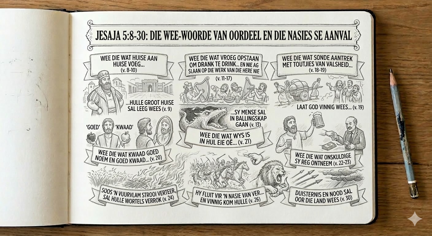 In hierdie gedeelte kondig God ses ellendes aan, wat telkens ingelui word met: “Wee hulle”. Teen hierdie tyd besef ons dat hoewel Jesaja vir die volk van Israel skryf elke gedeelte van toepassing gemaak kan word op die tyd waarin ons leef. Hierdie gedeelte is geen uitsondering nie, om die waarheid te sê, dit voel asof die profeet direk met die mense van vandag praat. Gierigheid, uitbuiting, dronkenskap, bedrog, onreg, en die omgekeerde stelsel van reg en verkeerd vier hoogty in ons tyd. Hierteen waarsku Jesaja met: “Wee jou!” Dit laat ons dadelik dink aan die “wee’s” van Openbaring en ons weet die uiteinde van elke wee is katastrofies vir die mens. Open 8:13 “En ek het gesien, en ek het ‘n engel wat hoog in die lug vlieg, met ‘n skril stem hoor roep: “Wee, wee, wee die bewoners van die aarde, wanneer die ander drie engele binnekort met ‘n geskal op hulle trompette blaas.”