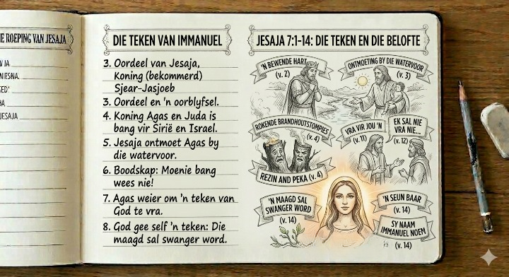 Jesaja noem God, “my God.” Tussen hierdie ongehoorsame mense staan ʼn gelowige man wat God ken. Hy het ʼn persoonlike verhouding met God en lewe in gehoorsaamheid aan hierdie God wat hy aanbid. God se oordeel is duidelik en Hy sal aan hulle ʼn teken gee, nou is dit ʼn teken van oordeel, omdat Agas die teken verwerp het. Jesaja 7:14 Daarom sal my Heer self vir julle ‘n teken gee: Kyk, die jong vrou is swanger, en gaan ‘n seun in die wêreld bring. Sy sal hom Immanuel noem” Hierdie profesie wys na Christus se geboorte. Die woord vir jong vrou is “almah” in die Hebreeus en daar is redelike kontroversie oor hierdie Hebreeuse woord. Baie sê dat indien daar van ʼn maagd gepraat word die Hebreeuse woord “betulah” gebruik moes word. Tog is dit interessant dat oral waar “almah” gebruik word dit vir ʼn jong dogter wat nog nie getroud was nie gebruik word. In teenstelling met “almah” word “betulah” in Joël gebruik vir ʼn vrou wat alreeds getroud was. Joël 1:8 Weeklaag soos ‘n jonkvrou wat oor die bruidegom van haar jeug met ‘n roukleed omgord is.(Ou vertaling). In die 2020 vertaling word bruidegom as verloofde vertaal hoewel die Hebreeuse, sowel as die Griekse vertaling van die LXX, duidelik verwys na haar man. Dit is dus duidelik dat God wou wys dat hierdie vrou sou swanger word sonder enige bydrae van ʼn man, ʼn feit wat die Nuwe Testament bevestig. Matteus 1:23 Kyk, die maagd sal swanger word en ‘n seun in die wêreld bring, en hulle sal Hom Immanuel noem – wat, as dit vertaal word, beteken God is met ons.