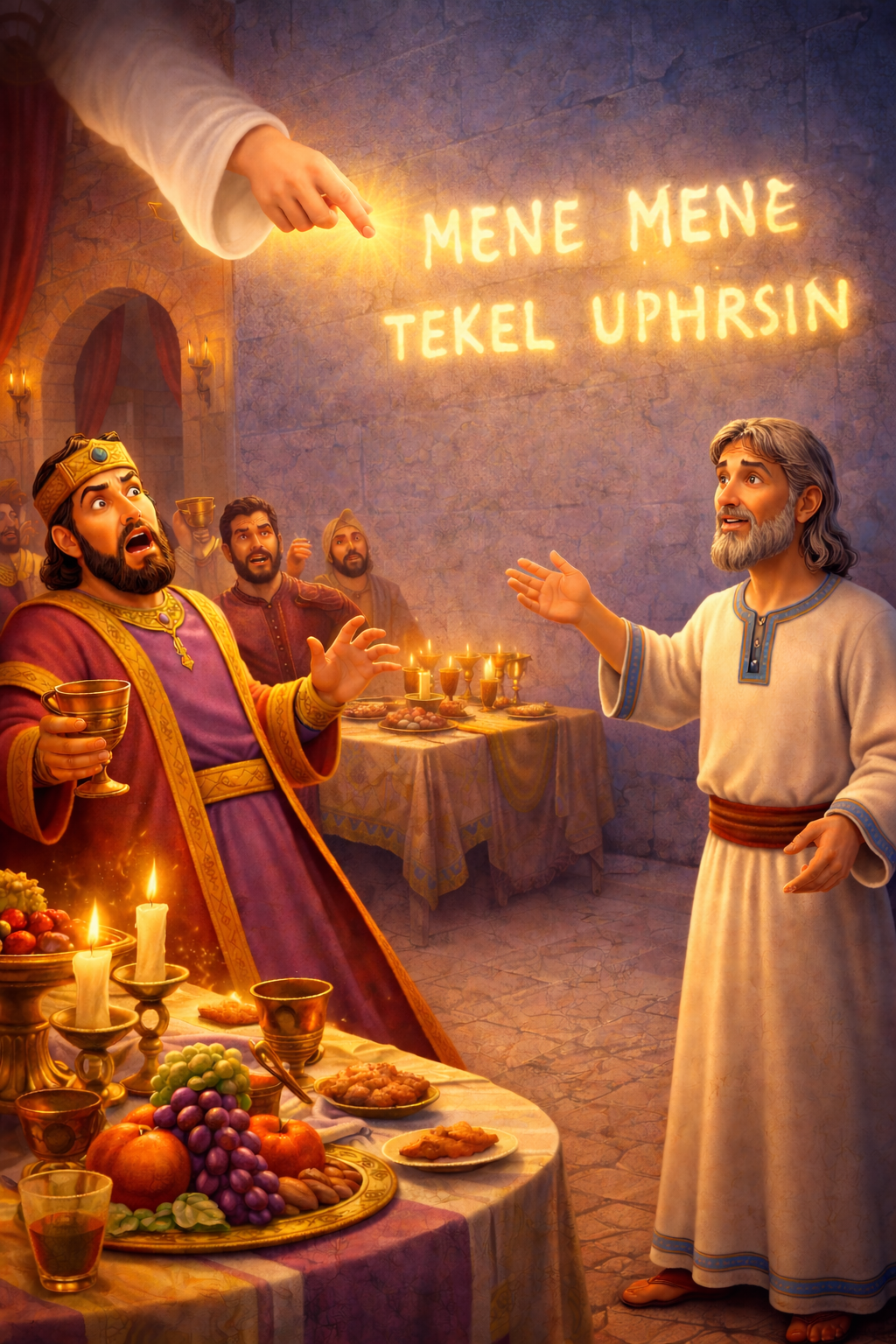 Skielik het vingers van ’n mens se hand verskyn en op die gepleisterde muur van die paleis begin skryf, oorkant die lamp. Die koning het die hand gesien wat skryf. Sy gesig het bleek geword en hy was so bang dat sy knieë teen mekaar geklap het.