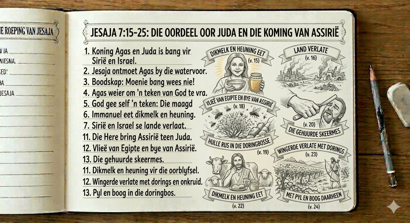 Die totale vernietiging van Israel sal egter oor ʼn tydperk plaas vind, maar na hierdie aanval begin hulle belasting betaal aan die Assiriese magte en word stelselmatig vernietig. Hier sien ons ook dat Agas, in stryd met God se opdrag deur Jesaja en sy opdrag in die Tora, die eerste vyf boeke van die Skrif, die Assiriese magte nader om hom te help. Eksodus 23:32 Jy mag nie met hulle of hulle gode ‘n verbond sluit nie. Hoe tragies as die mens nie wil wag op God se antwoord nie en op hul eie insigte staatmaak, teen God se opdrag. Dit is natuurlik die verhaal van so baie in die Ou Testament. Hier dink ons aan Sara en Abraham wat besluit om die geboorte van ʼn seun in hulle eie hand te neem en so word Ismael gebore, nie volgens God se belofte nie, maar volgens die vlees. Tot vandag toe ervaar Israel die gevolg van Abraham en Sara se ongeduld. Net so kon Saul nie wag vir Samuel om te kom om ʼn offer te bring nie en besluit om self, in stryd met God se gebod, ʼn offer bring. Die ironie is treffend – ʼn offer vir God teen sy bevel. So baie keer wil mense hul sonde en ongehoorsaamheid toedraai in “Ons doen dit vir die Here.” Ek gaan na plekke waar ek nie moet gaan nie, maar dan regverdig ek dit met “Ek vertel mense daar van die Here” of ek kyk en lees dinge wat Hy verbied, maar redeneer dat ek dan “ander kan reghelp” as hulle oor die fliek of boek praat. So baie keer word ons grootste begeertes juis ons grootste straf. Psalms 106:15 Hy het vir hulle gegee wat hulle gevra het, maar Hy het ‘n verterende siekte in hulle kele laat ontstaan. Hierdie besluit van Agas sou Juda duur te staan kom en sal erger wees as die dag toe die tien stamme van Israel van hulle af weggebreek het.